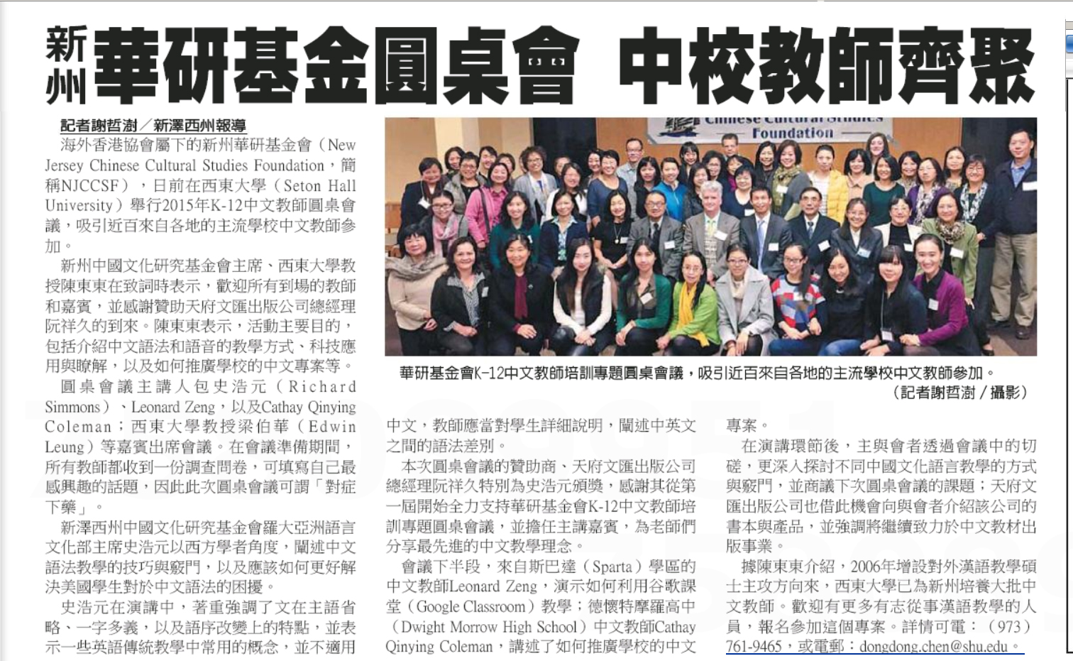 海外香港協會屬下的新州華研基金會(New Jersey Chinese Cultural Studies Foundation,簡稱NJCCSF),日前在西東大學(Seton Hall University)舉行2015年K-12中文教師圓桌會議,吸引近百來自各地的主流學校中文教師參加。